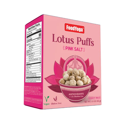 FoodYoga lotus puff or popped lotus seed snack with added yogic herbs available in 4 flavors.