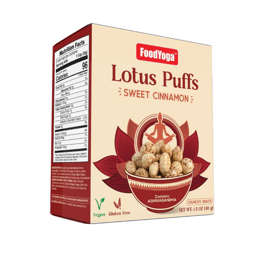 FoodYoga Lotus Puff Snack with added ashwagandha and brahmi. The mild sweet cinnamon flavor is great for your post yoga sweet craving